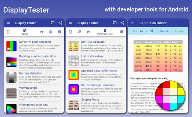 DisplayTester makes it possible to test almost every aspect of your device's LCD/OLED screen. Using Google Cast it is possible to test the display quality of your TV. It is designed to allow full screen testing also on devices with soft keys (hiding the soft keys in ICS and later, immersive mode in KitKat and later).